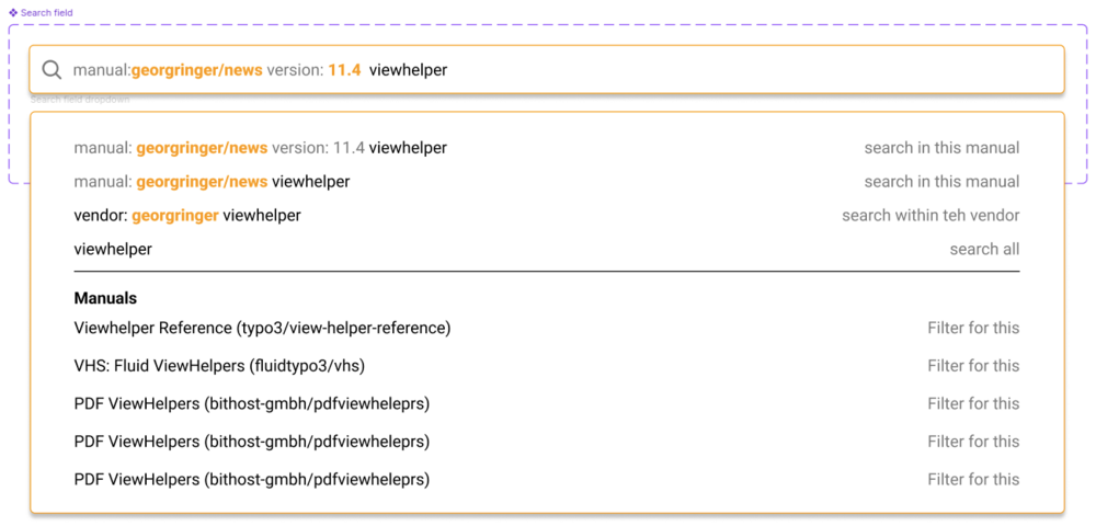 manual | Allows to search only documentation which belongs to the given manual (vendor/package). Examples: georgringer/news, typo3/cms-core (so the scope is given composer package) |